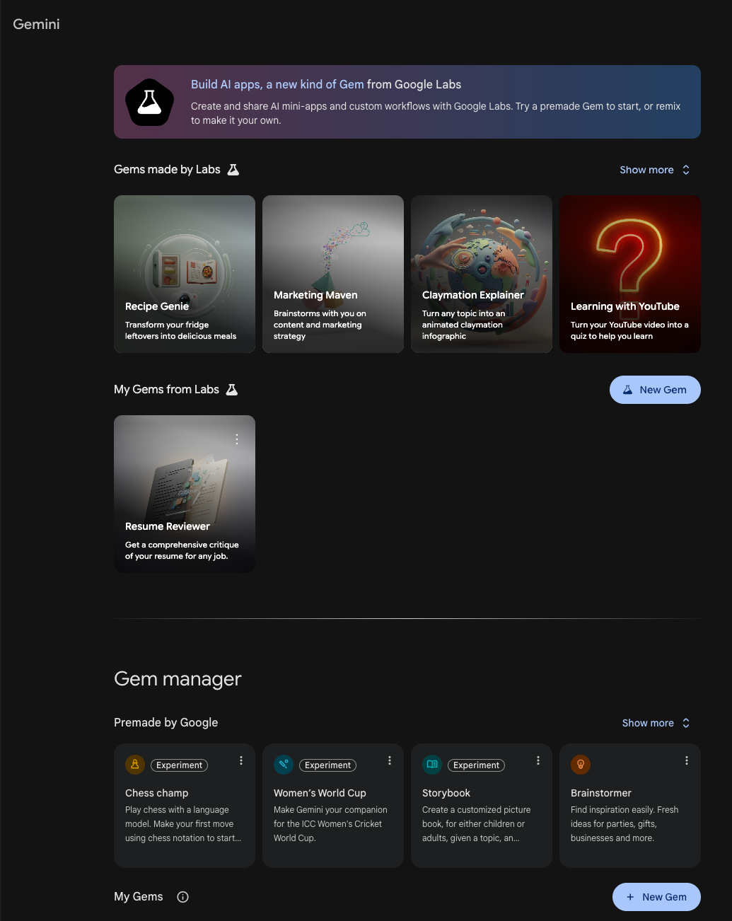| Gem (Standard) | 具有單一系統指令(角色設定)的自定義 Gemini 版本。 |