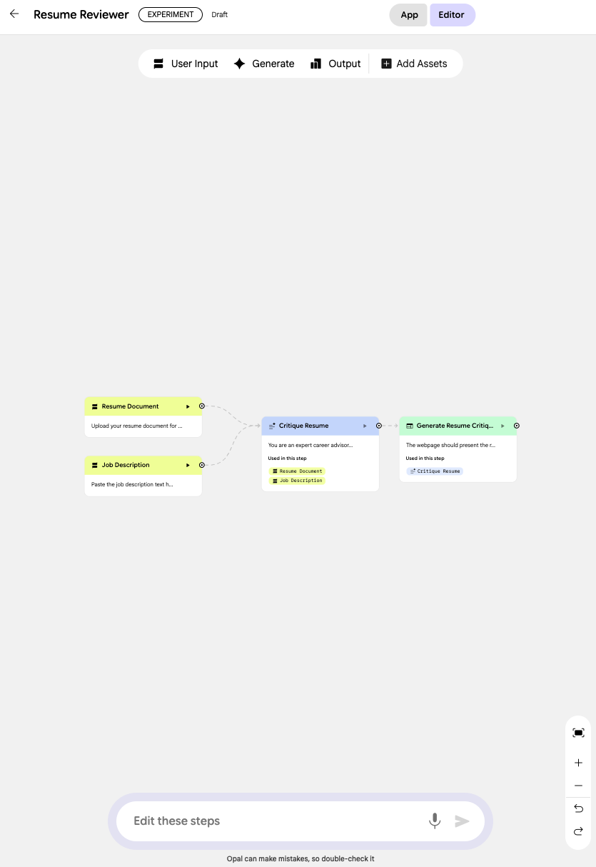 每一個 Opal 應用程式的核心都是一個工作流編輯器,這通常隱藏在對話介面之後,但可以透過「進階編輯器」(Advanced Editor)訪問。這個編輯器將應用程式邏輯視覺化為一系列連接的節點或「步驟」。